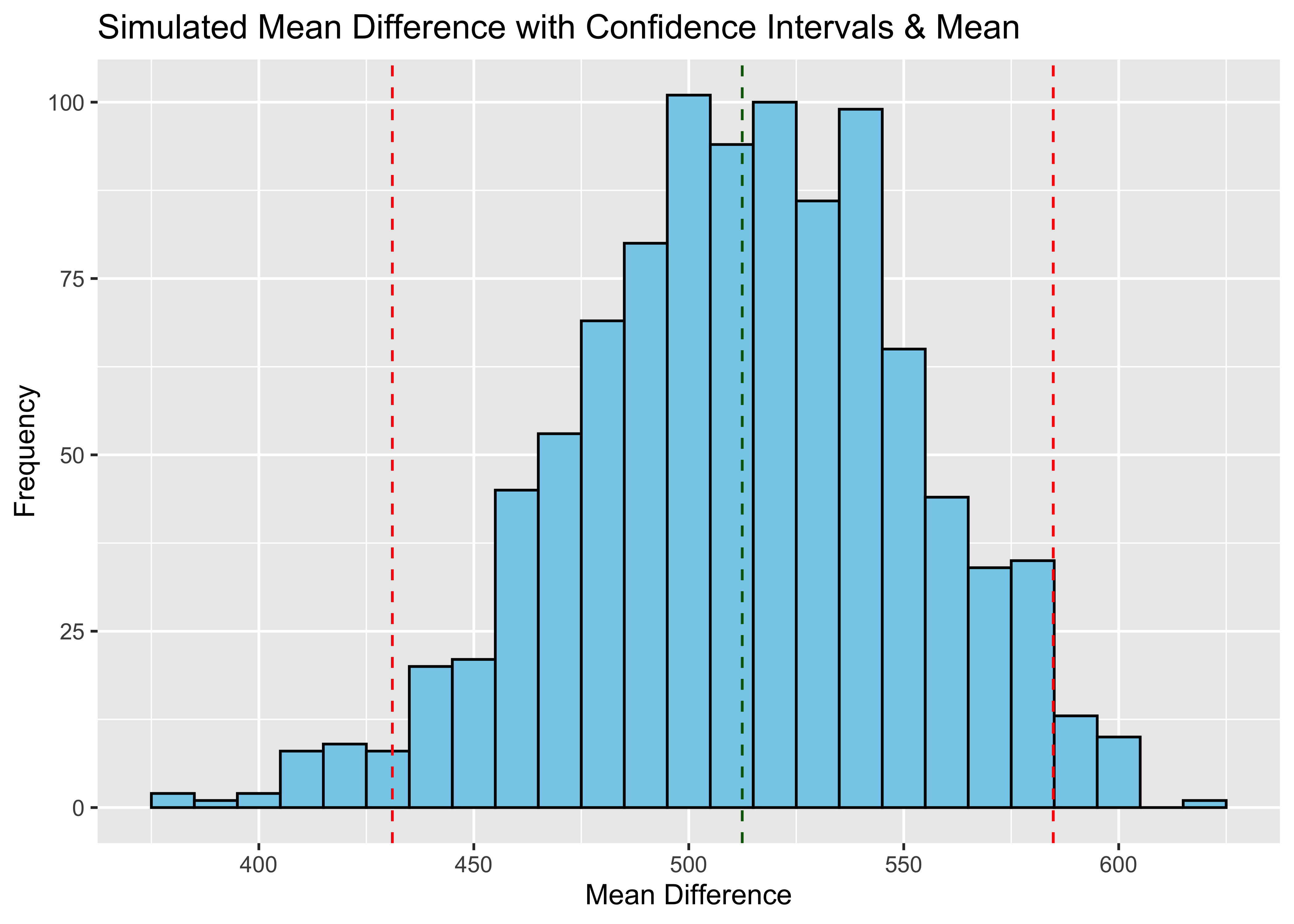 ggtitle("Simulated Mean Difference with Confidence Intervals & Mean ")