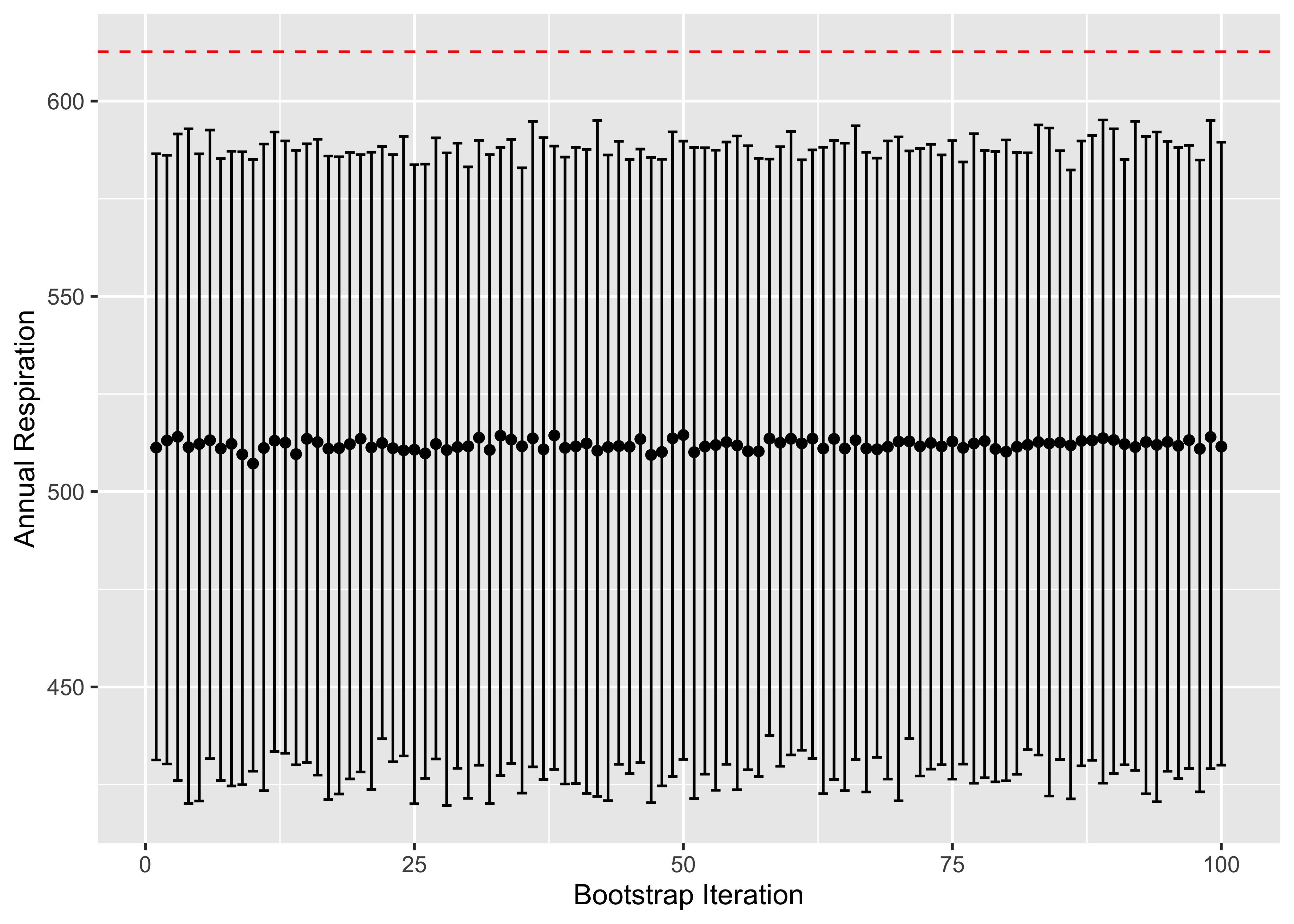 labs(x="Bootstrap Iteration", y="Annual Respiration", main="Distribution of Confidence Intervals in Relation to Observed Statisitc")